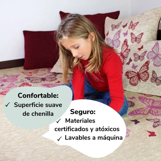 Listos para volar con la fantasía entre elegantes mariposas? El Trío de Fundas de Cojines temático de las mariposas, gracias a su amplia y suave superficie de chenilla es perfecto para usar en el rincón de juegos de tu hijo, proporcionando una cómoda sentada durante sus diferentes actividades.