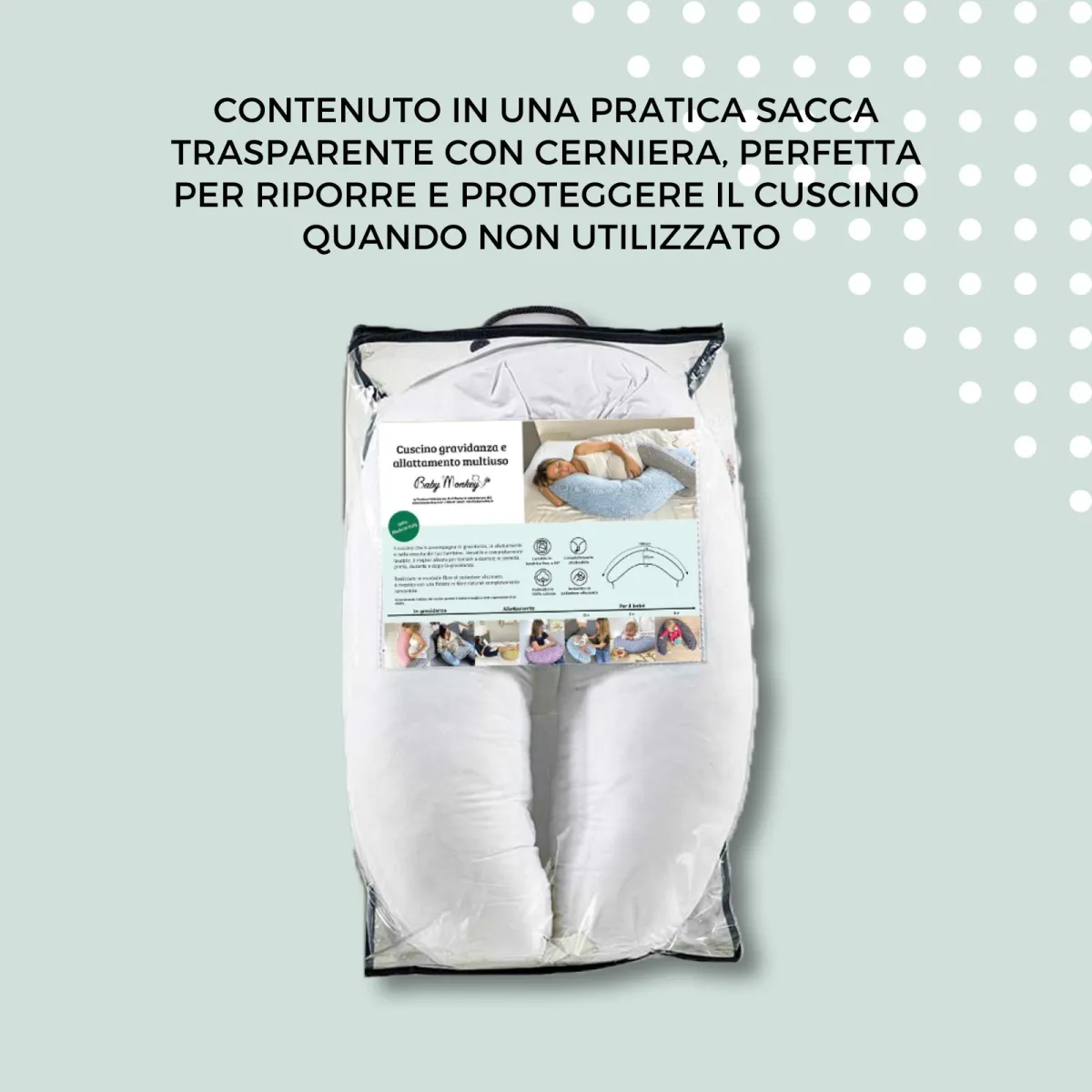 Un solo producto utilizable en muchas situaciones: durante el embarazo, como ayuda para dormir mejor, como apoyo lumbar, para amamantar, para el tummy time!