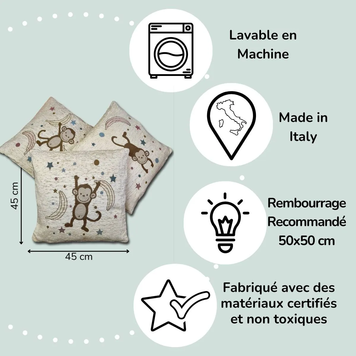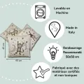 Les housses de coussin pour enfants BabyMonkey sont fabriqués en Italie, en utilisant matières premières certifiées et pigments non toxiques, ils sont donc sûrs pour la santé des bébés.