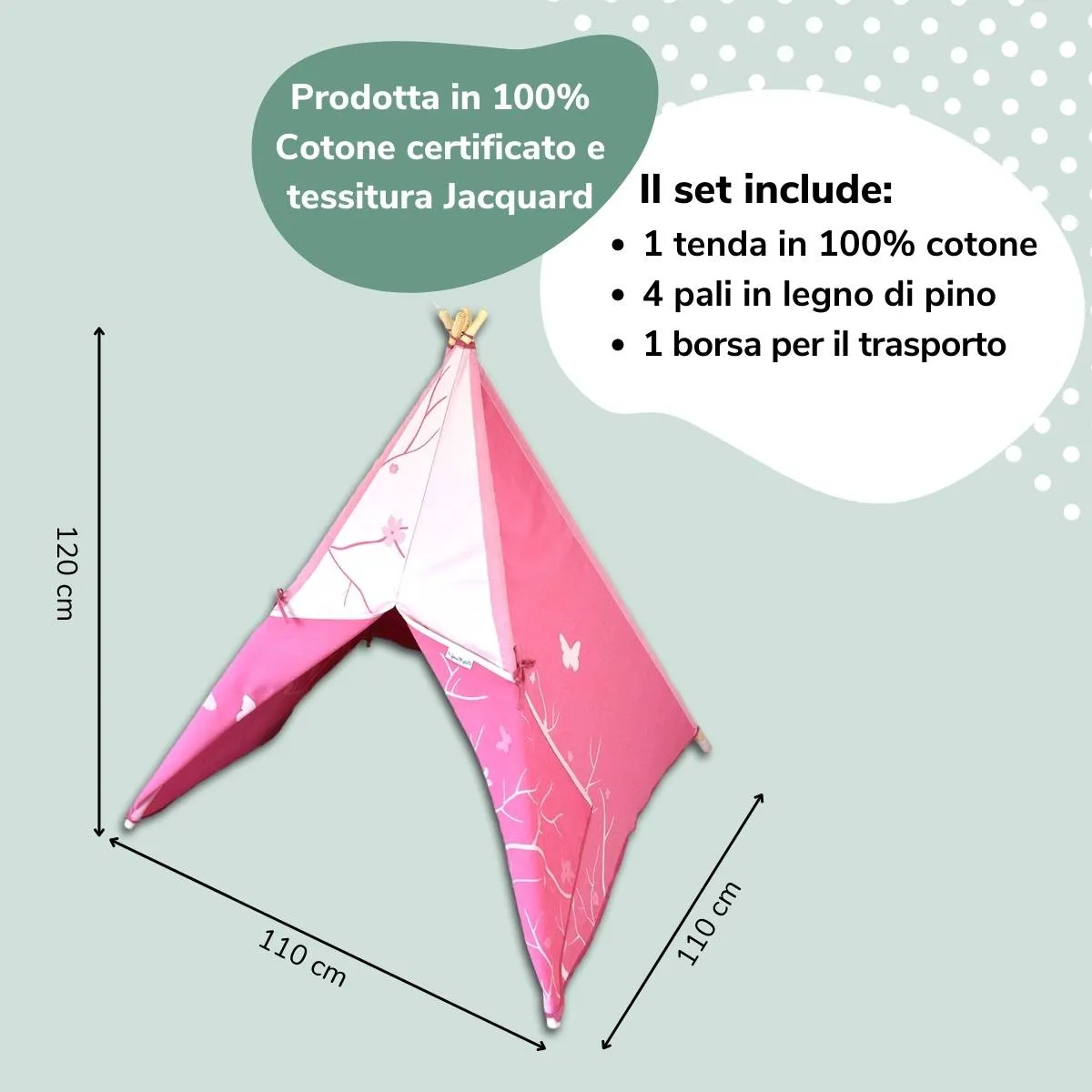 Tenda teepee indiano gioco perfetta per arredare la cameretta del tuo bambino.Crea un ambiente arredato con cura, con dettagli montessoriani e perfetti per la crescita del tuo bambino. Leggera e facile da montare, la tenda viene venduta con una borsa colorata in cui riporla, che la rende ideale per essere trasportata ovunque tu voglia senza fatica.